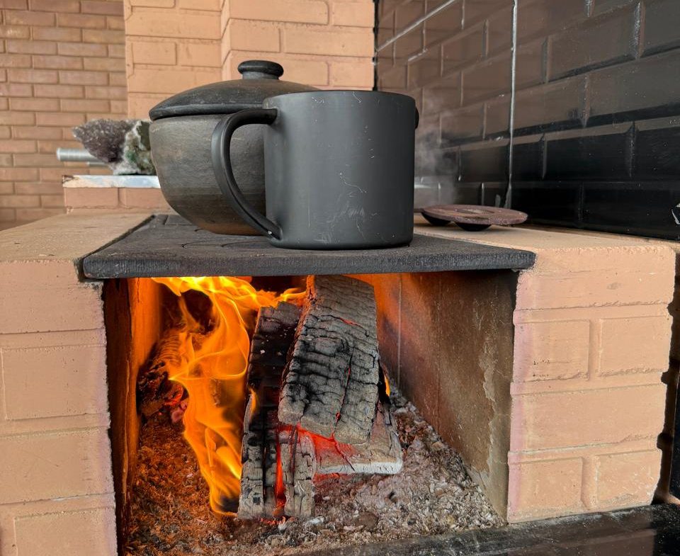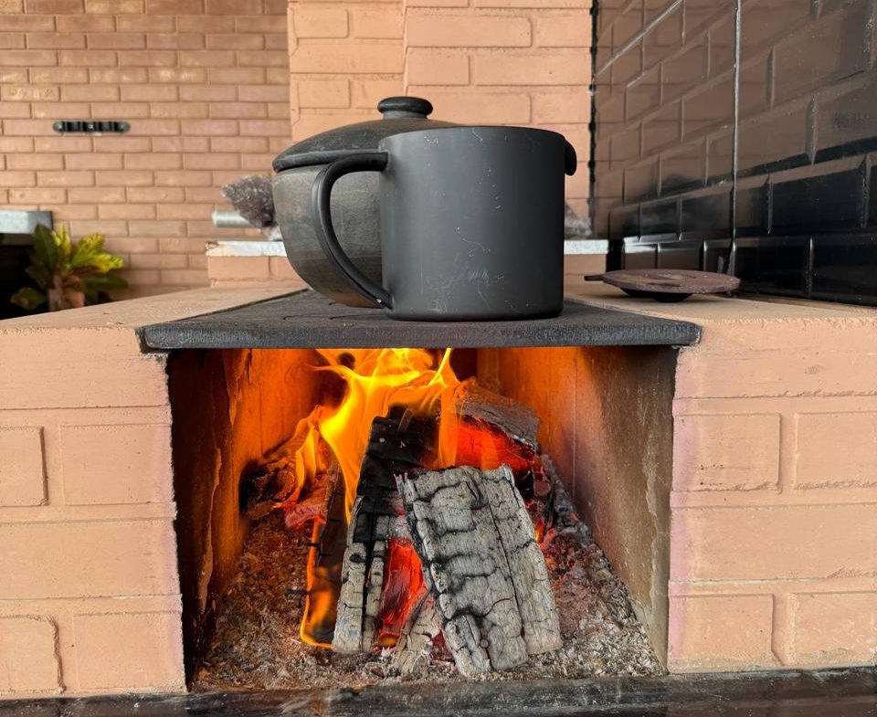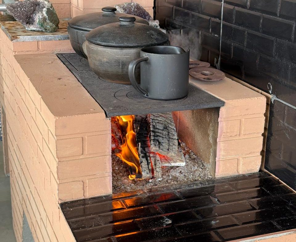 ✅ Área gourmet com churrasqueira, mesa rústica de madeira maciça para 12 pessoas, fogão a lenha e piscina